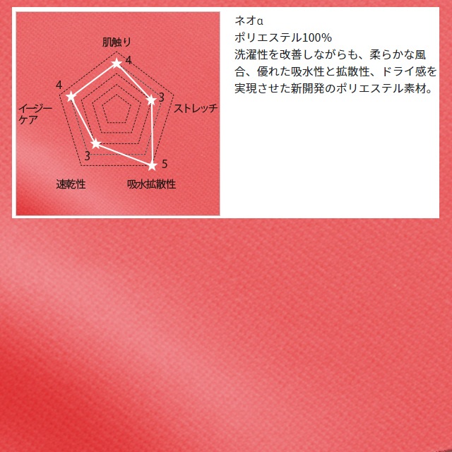 素材にはポリエステル100%のネオαを使用。洗濯性を改善しながらも、柔らかな風合、優れた吸水性と拡散性、ドライ感を実現させた新開発のポリエステル素材です。