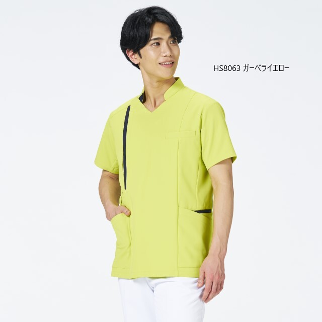 左襟、フロント、ポケット口に効かせた配色で明るい印象に。胸下のポケットは、前かがみになった時もPHSやスマートフォンが落ちにくい仕様。