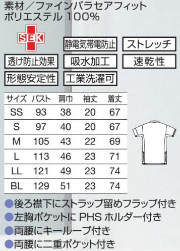●特徴:両腰にキーループ付き、後ろ襟下にストラップ留めフラップ付き、左胸ポケットにPHSホルダー付き