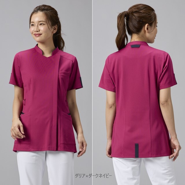 顔廻りを明るくするボタンや配色、機能的なポケットや女性らしく見えるシルエットで機能性とデザイン性の両立をしたメディカルウェアです。