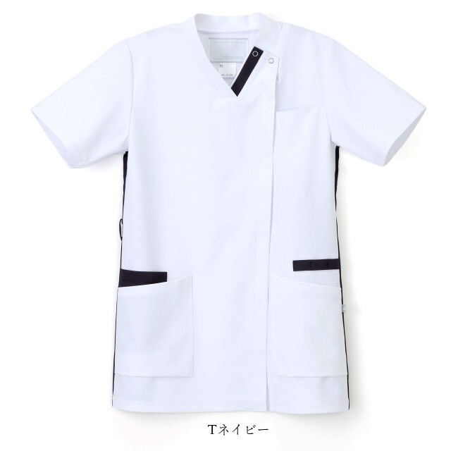 アシンメトリーな衿配色のシンプルな男女兼用スクラブ。