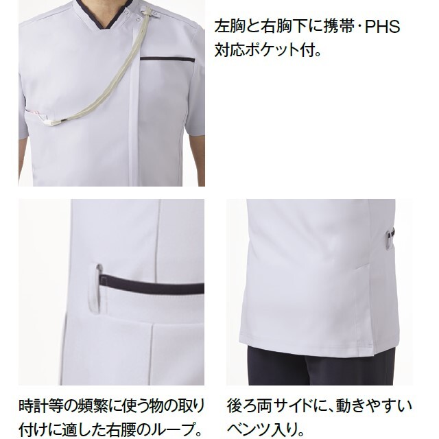 ・左胸と右胸下に携帯・PHS対応ポケット付。