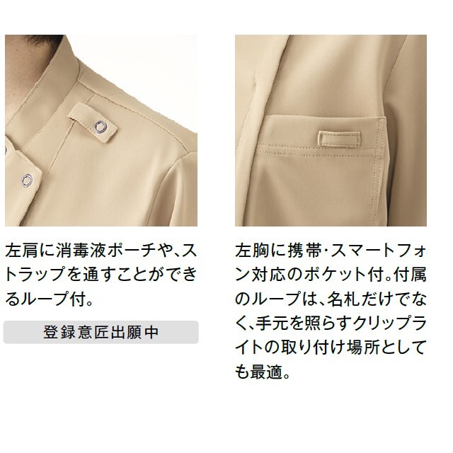●特徴:左肩ループ、左胸に携帯・スマホ対応ポケット、左胸に名札ループ、右腰ポケット上部にループ、左腰ポケットに内ポケット、サイドベンツ、比翼ファスナー仕様