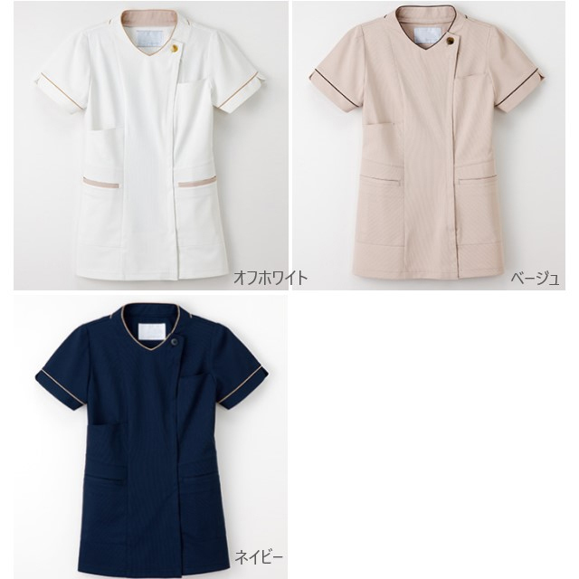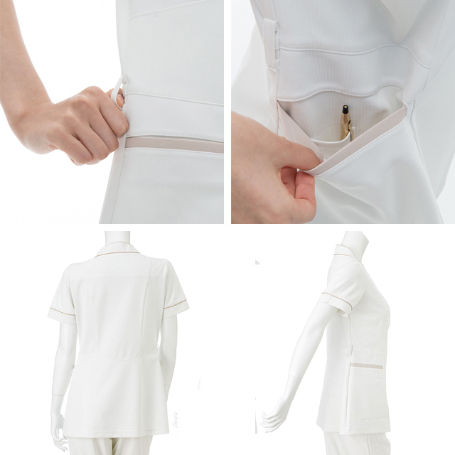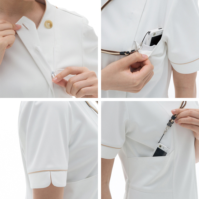 女性らしい襟元が優しさを感じさせます。女性らしい襟元がやさしい雰囲気。襟ぐりの配色・パイピングと胸ボタン。きっちりとした腰ポケットが新しさを感じさせてくれルデザインです。