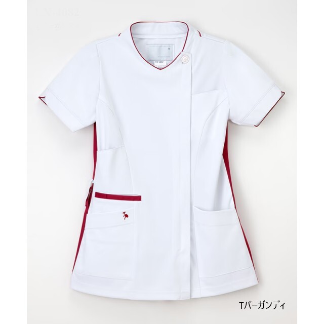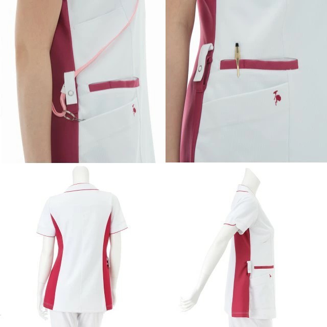 色ごとに違う幸せを予感させるモチーフがポケット口に刺繍されています。優しいイメージの衿元と袖口のデザインが患者さんに癒しを与えます。右脇のダブルループが機能的です。涼感素材を使用し、着用しやすいファスナー開きです。