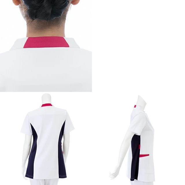 身頃から続け断ちの後ろハイネックや、アシンメトリー切り替えの配色がスタイリッシュなデザインスクラブ。