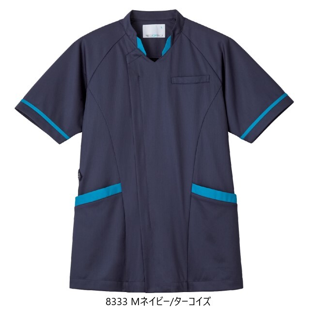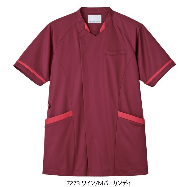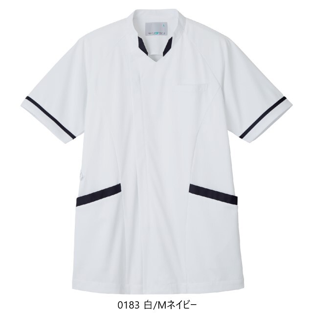 医療従事者の声を反映させた細やかな作りになっており、衿元はシャープな配色デザインで胸元がのぞかず安心な設計。