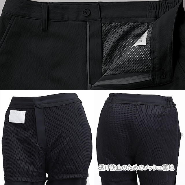 ●仕様:前ファスナーあき、ウエスト脇ゴム、メッシュ裏地付き、両脇ポケット、左右ヒップポケット