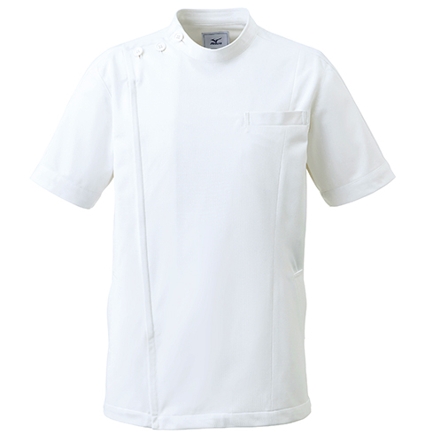 ペンなどの収納に便利な胸ポケット、右肩3つのボタンで留めるデザイン、サイドファスナーで着脱がスピーディ、両サイドに手を差し込みやすい斜めポケット付き。