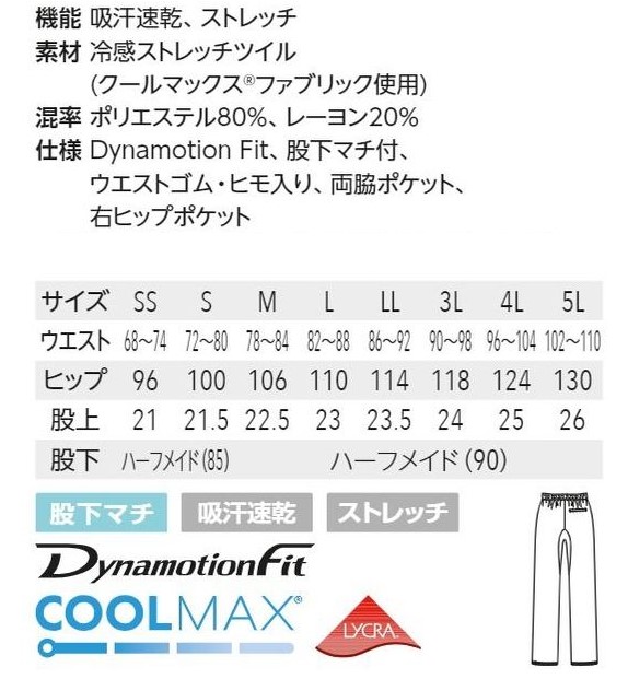 ●特徴:Dynamotion Fit(ダイナモーションフィット)、股下マチ付き、ウエストゴム・ヒモ入り、両脇ポケット、右ヒップポケット