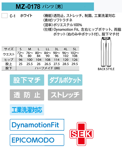 ウエスト脇ゴム、左右ヒップポケット、両脇ポケット(右のみ中ポケット)、股下マチ付