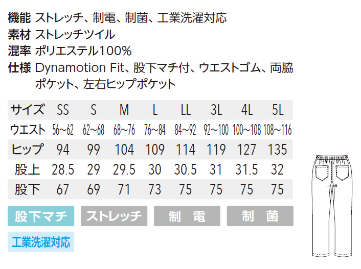 仕様:Dynamotion Fit 股下マチ付 ウエストゴム 両脇ポケット 左右ヒップポケット