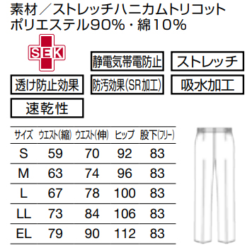 ●機能:制菌加工 静電気帯電防止 ストレッチ 透け防止効果 防汚効果(SR加工) 吸水加工 速乾性 形態安定性 二重ポケット