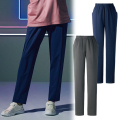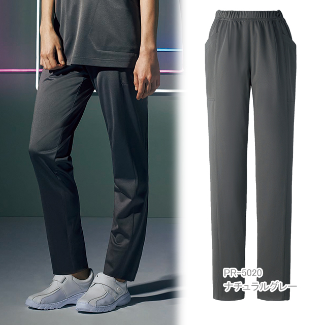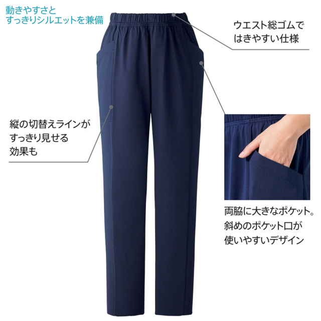 ウエスト総ゴムで履きやすい仕様。縦の切り替えラインがすっきり見せる効果も。両脇に大きなポケット。斜めのポケット口が使いやすいデザイン。