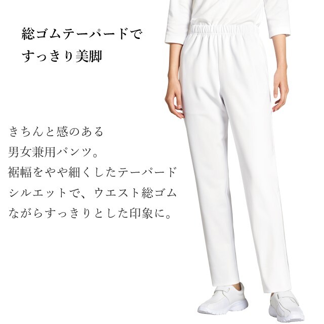 裾幅をやや細くしたテーパードシルエットで、ウエスト総ゴムながらすっきりした印象に。