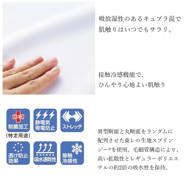 ●機能:制菌加工 静電気帯電防止 ストレッチ 透け防止 吸水速乾性 接触冷感 工業洗濯可