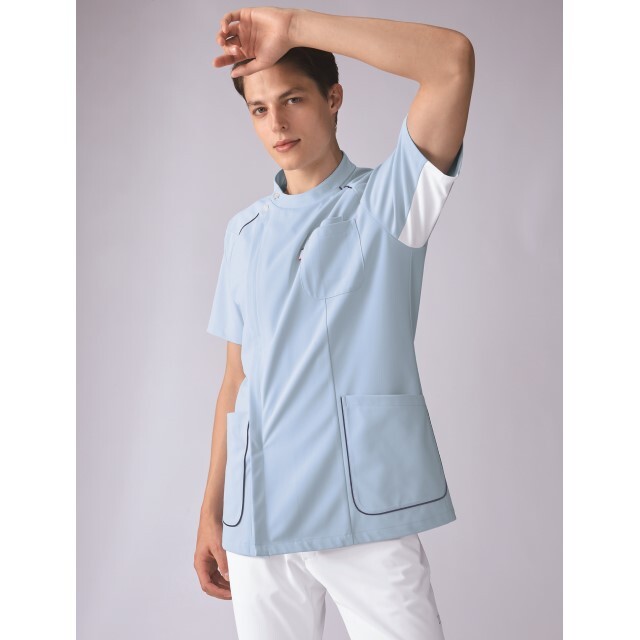 すっきりとしたスタンドカラーと、腕の上げ下ろしがスムーズな立体裁断で、長時間の勤務も快適に。