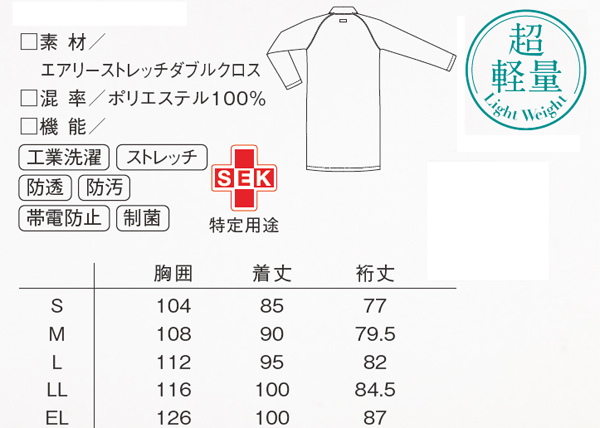 ●機能:軽量 工業洗濯 ストレッチ 防透 防汚 帯電防止 制菌