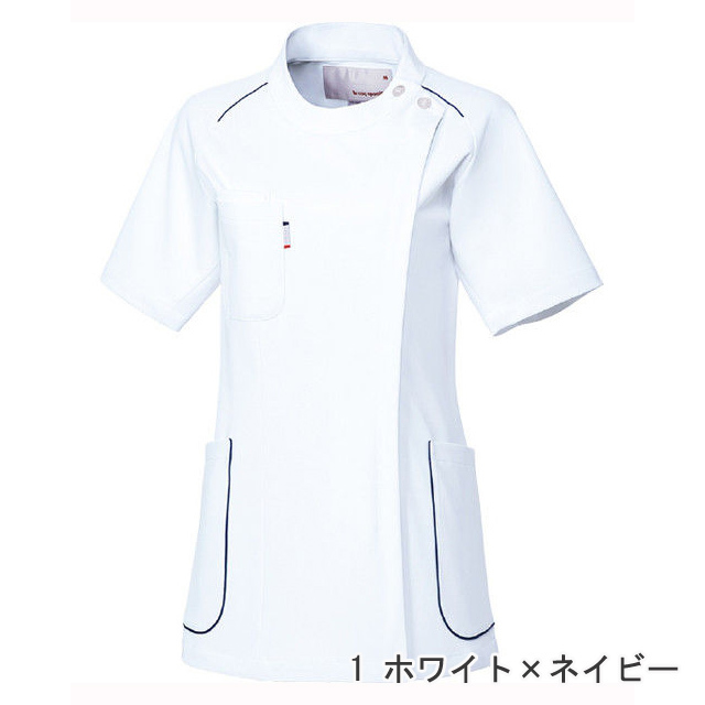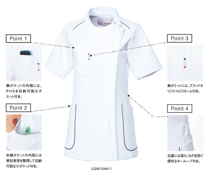 すっきりとしたスタンドカラーと、腕の上げ下ろしがスムーズな立体裁断で、長時間の勤務も快適に。