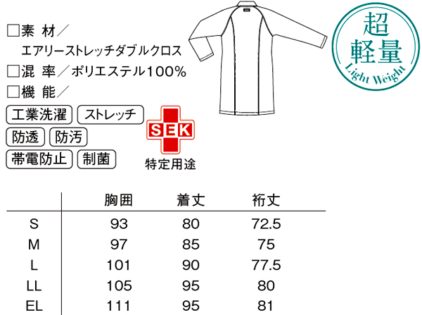●機能:軽量 工業洗濯 ストレッチ 防透 防汚 帯電防止 制菌