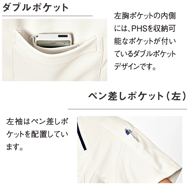左胸ポケットの内側には、PHSを収納可能なポケットが付いてるダブルポケットデザインです。