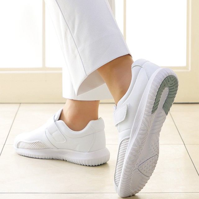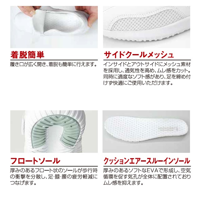 厚みのあるソフトなEVAで形成し、空気循環を促す気孔が全体に配置された「クッションエアースルーインソール」を採用しており、ムレ感と疲労を軽減します。また、アッパー(甲)には、通気性に優れたメッシュ素材を採用し、ムレにくくより一層の快適感が得られました。
