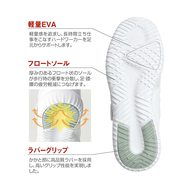 厚みのあるフロート状のソールが歩行時の衝撃を分散し、足・膝・腰の疲労軽減につなげます。かかと部には高品質ラバーを採用しており、高いグリップ性能を実現しています。また、つま先を巻き上げることにより、足の取り出しがスムーズでつまずきにくい設計にもなっています。