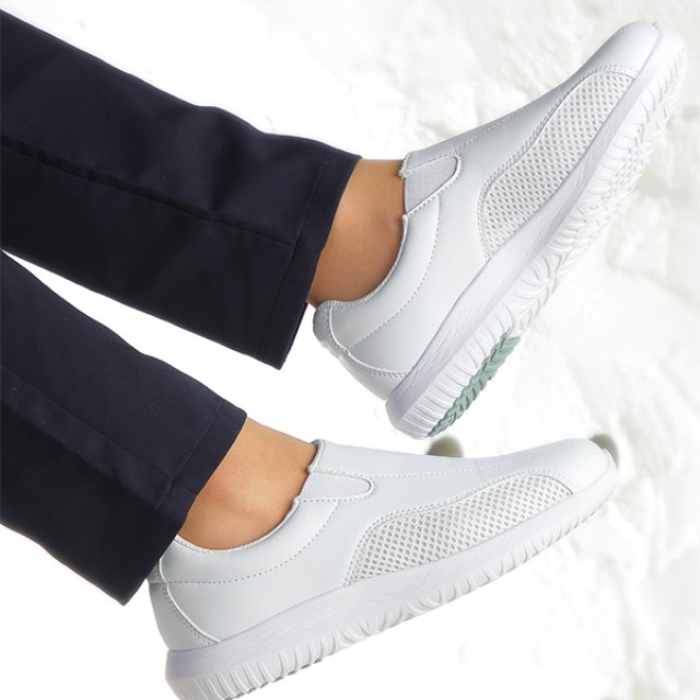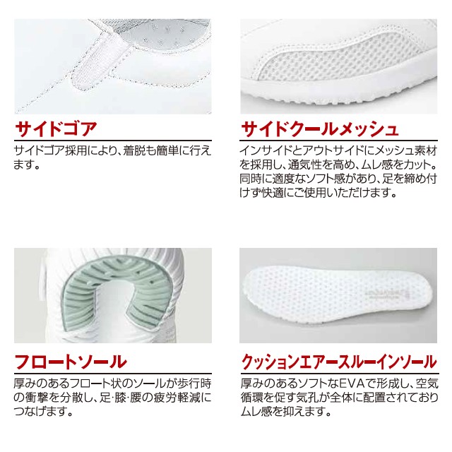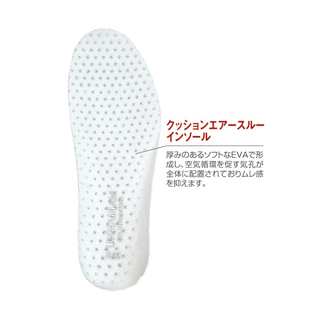 厚みのあるソフトなEVAで形成し、空気循環を促す気孔が全体に配置された「クッションエアースルーインソール」を採用しており、ムレ感と疲労を軽減します。また、アッパー(甲)には、通気性に優れたメッシュ素材を採用し、ムレにくくより一層の快適感が得られました。
