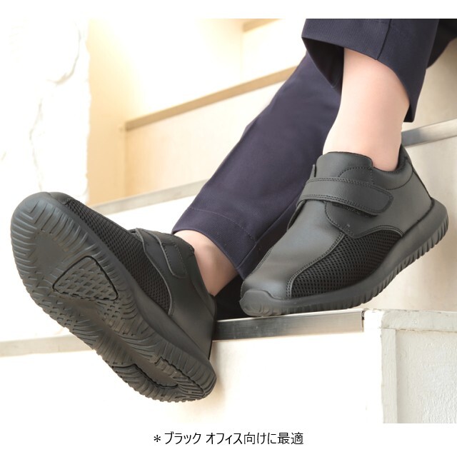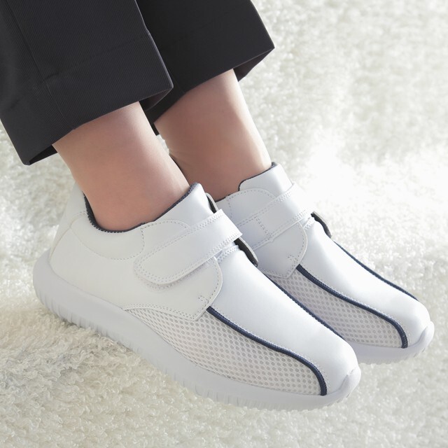 厚みのあるフロート状のソールが歩行時の衝撃を分散し、足・膝・腰の疲労軽減につなげます。かかと部には高品質ラバーを採用しており、高いグリップ性能を実現しています。また、つま先を巻き上げることにより、足の取り出しがスムーズでつまずきにくい設計にもなっています。