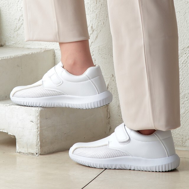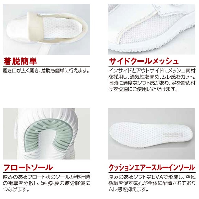 厚みのあるソフトなEVAで形成し、空気循環を促す気孔が全体に配置された「クッションエアースルーインソール」を採用しており、ムレ感と疲労を軽減します。また、アッパー(甲)には、通気性に優れたメッシュ素材を採用し、ムレにくくより一層の快適感が得られました。