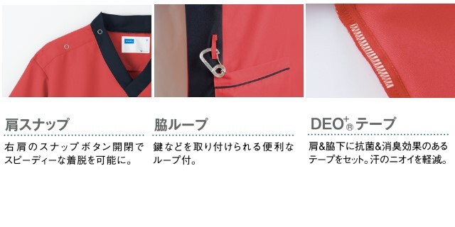 細部にまで追求した実用ディティールと動きやすいデザインのカラフルなスクラブです。