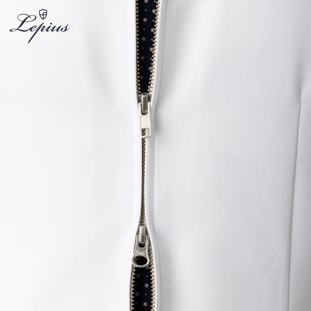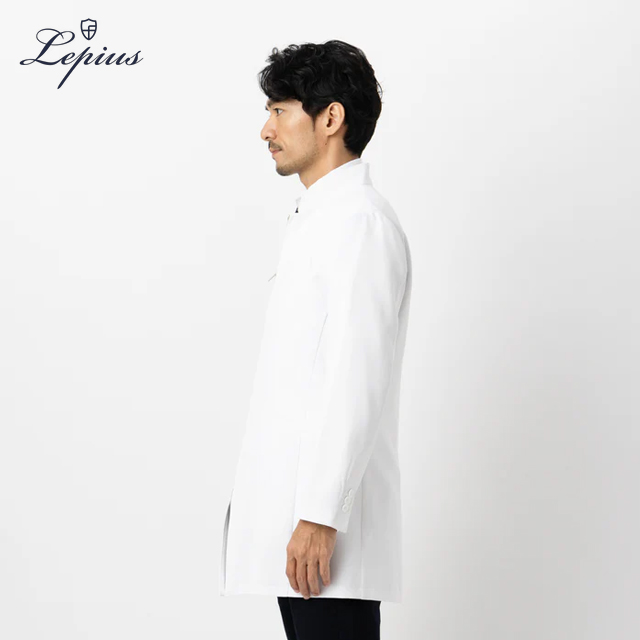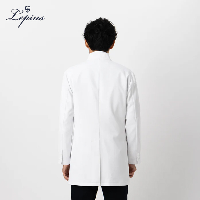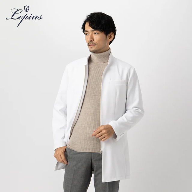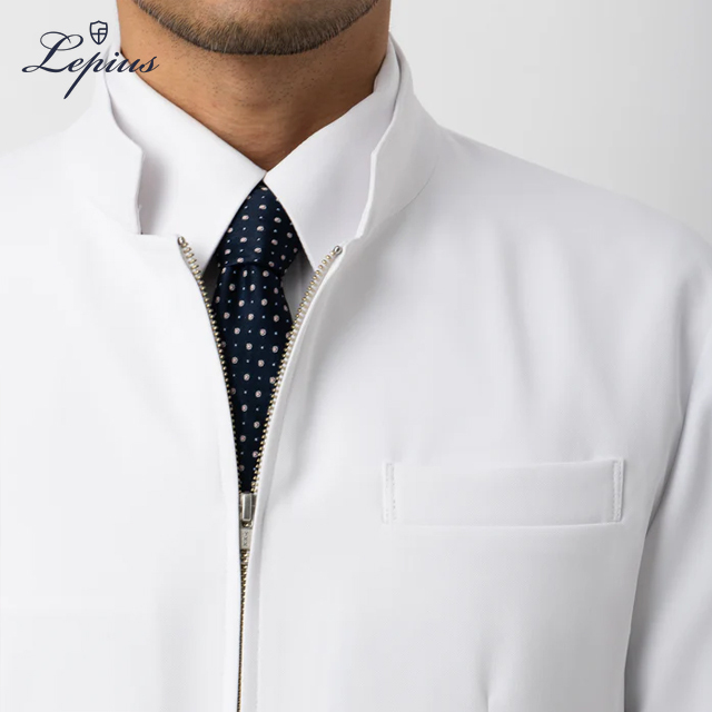 程よい高さのスタンドカラーにジッパー(ファスナー)を合わせた、スポーティテイストのメンズ白衣。