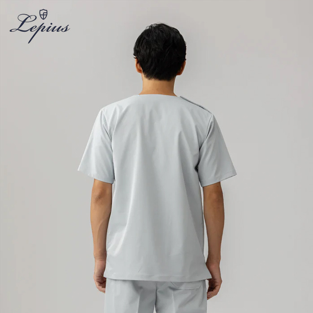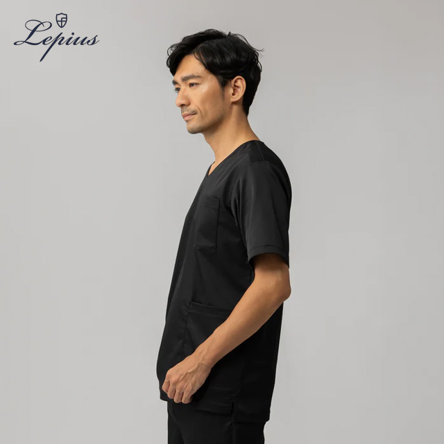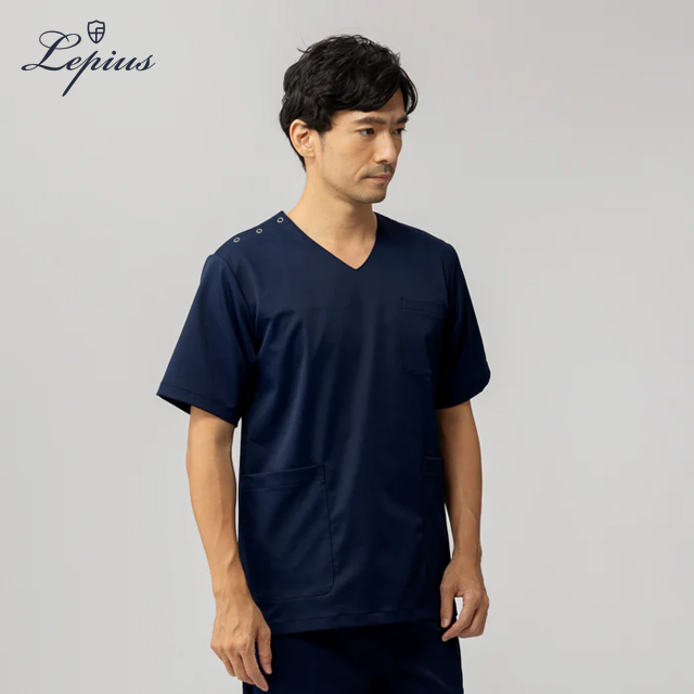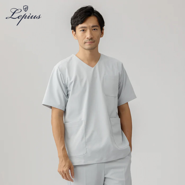 Vネックのシンプルでシックなメンズスクラブ。4ポケット付き。生地は上品で控えめな光沢がある中肉素材。一次撥水加工つきストレッチ素材で機能性に富んだスクラブです。大人気のブラックをはじめ、爽やかなライトグレー、定番のネイビーなど、どれも素敵なカラーバリエーションを取りそろえました。お好きなカラーをお選びください。