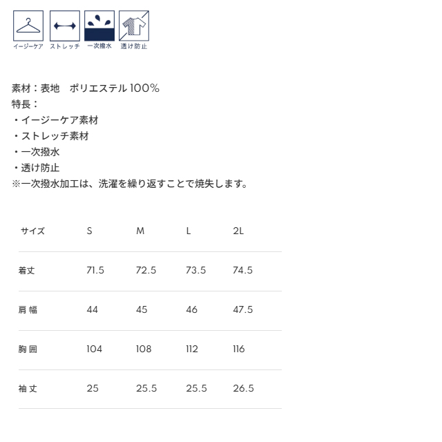 ※一次撥水加工は、洗濯を繰り返すことで焼失します。