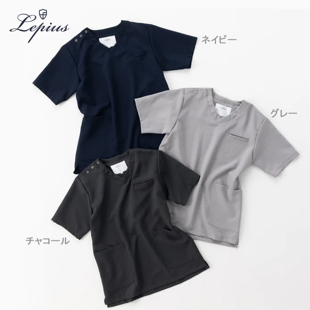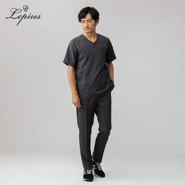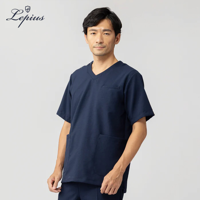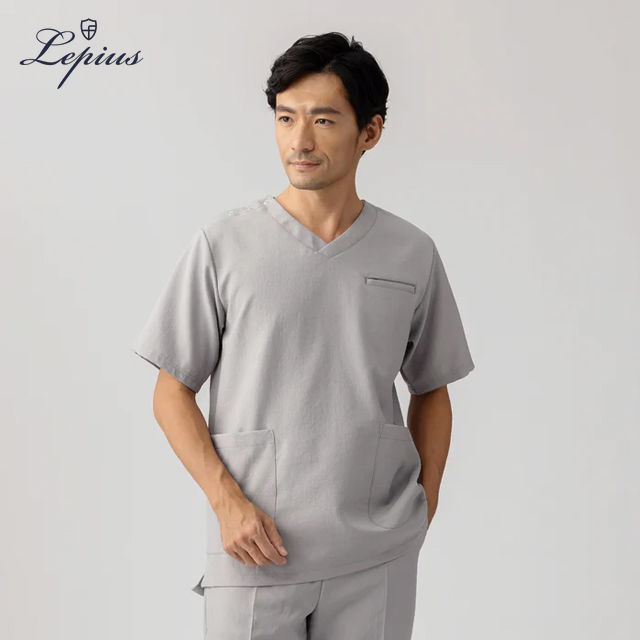表面に味のあるシワ加工を施した素材を採用し、ベーシックなデザインで上品なファッション性の高いスクラブに仕上げました。4ポケットとストレッチ素材で機能性も高い製品です。