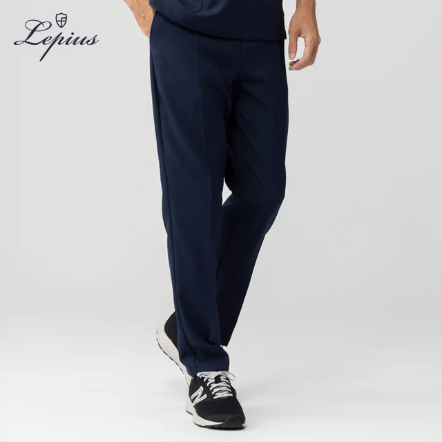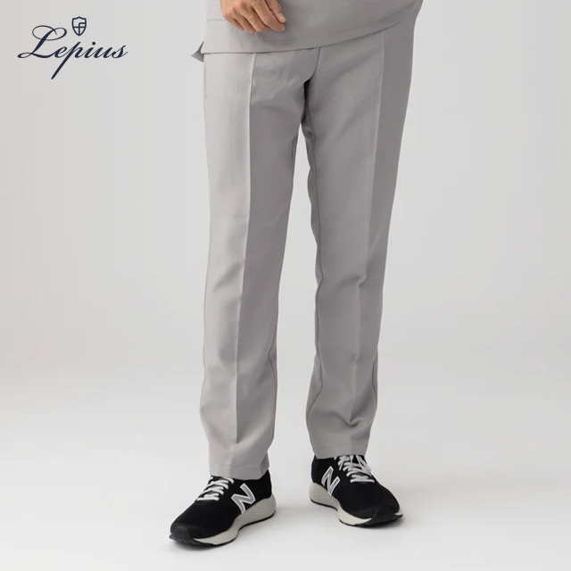 表面変化のあるシワ加工素材と、センタープレスの入ったスリムなシルエットの上品なスクラブパンツ。ストレッチが効いており、細身でも機能的なパンツです。