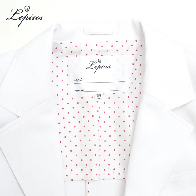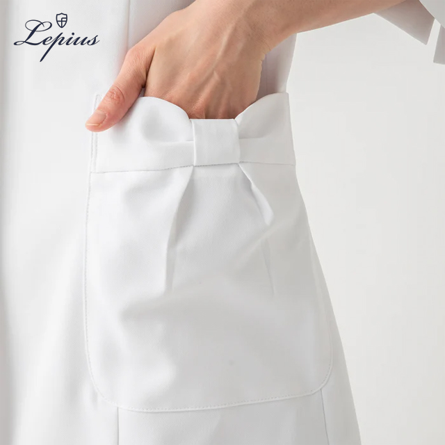 両腰にあるリボンポケットがとってもかわいいと大人気のレディース白衣。タックを入れたリボンモチーフは、中にものを入れても型崩れせず、デザインと使いやすさを両立した優れもの白衣。衿は凛とした雰囲気のテーラードカラーで、医師としての威厳を保ちます。裏地&バインダーはホワイト×ローズ水玉で仕上げています。