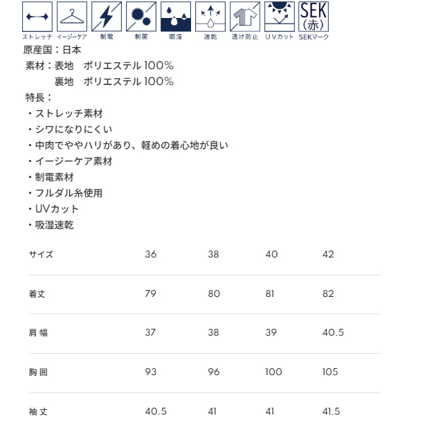 ●機能:ストレッチ イージーケア 制電 制菌 吸湿 速乾 透け防止 UVカット