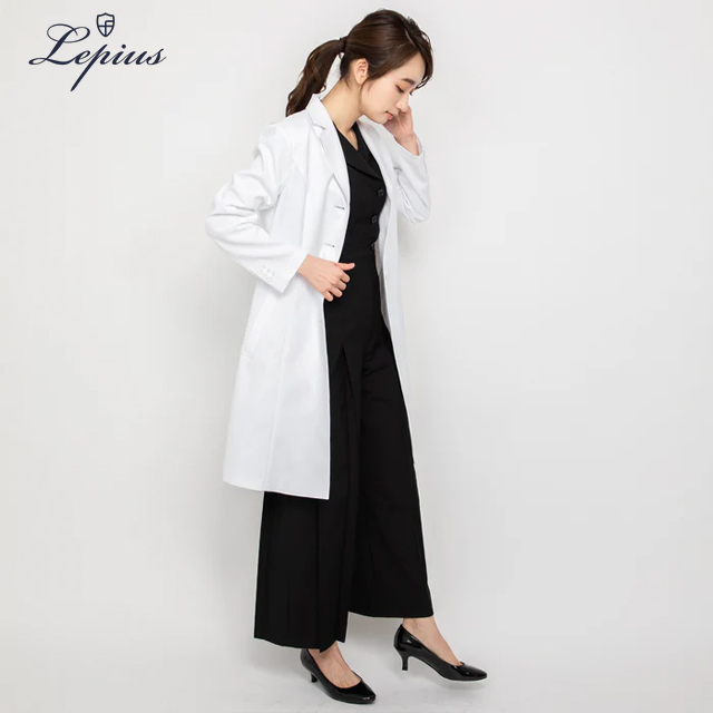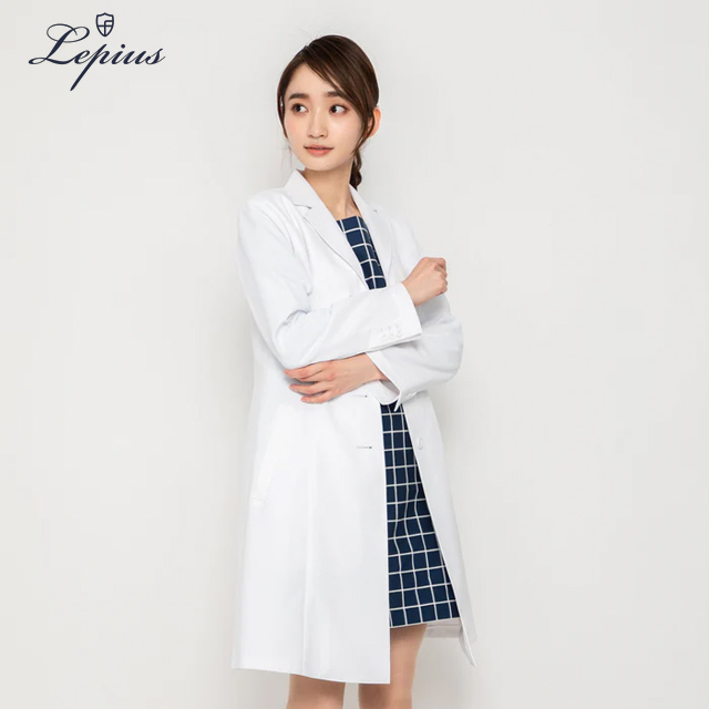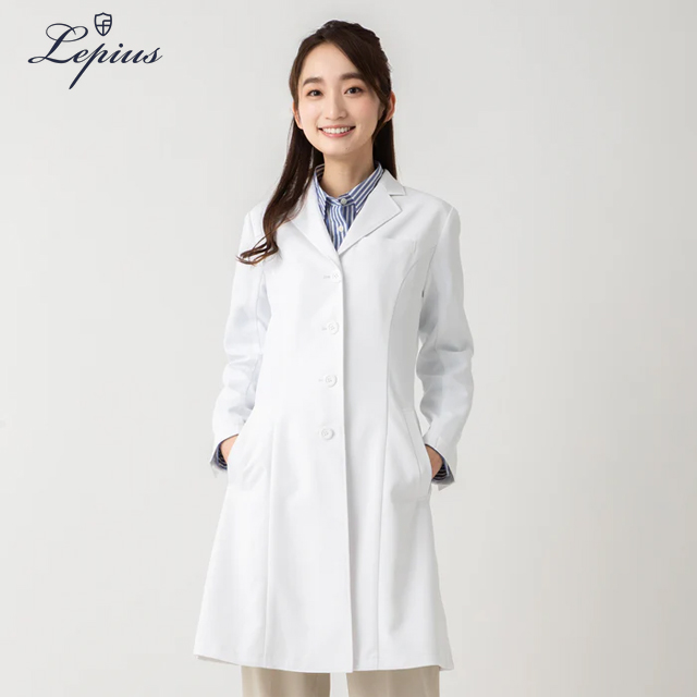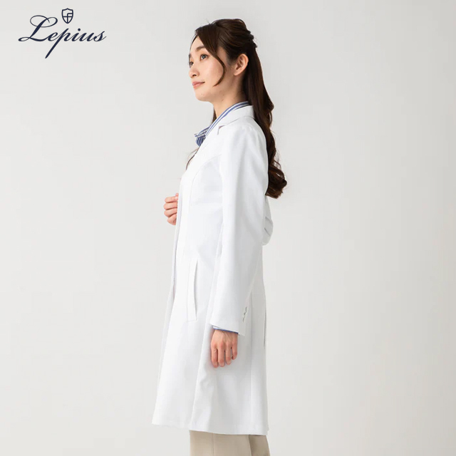 立体的なバストから、絞られたウエストを経て、裾へと流れる構築的かつ、自然なフレアラインがまるでワンピースドレスのようだと、女性医師の皆様から好評をいただいている白衣。ウエストサイズは見た目ほど絞っておらず、バストを立体的に作りスカートのフレアを出すことで、ウエストを絞った着痩せ効果を発揮する、バランスとパターンメイキングの技あり白衣。