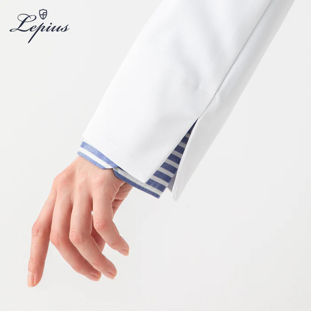 パンツやスカートなどどんなボトムスにも合うように絶妙な着丈を実現しました。ボトムスに迷うことなくバランスの取れた着こなしができる白衣です。加えて下半身が気になる女性にも、ちょうどよくヒップが隠れる着丈のため安心して着られます。