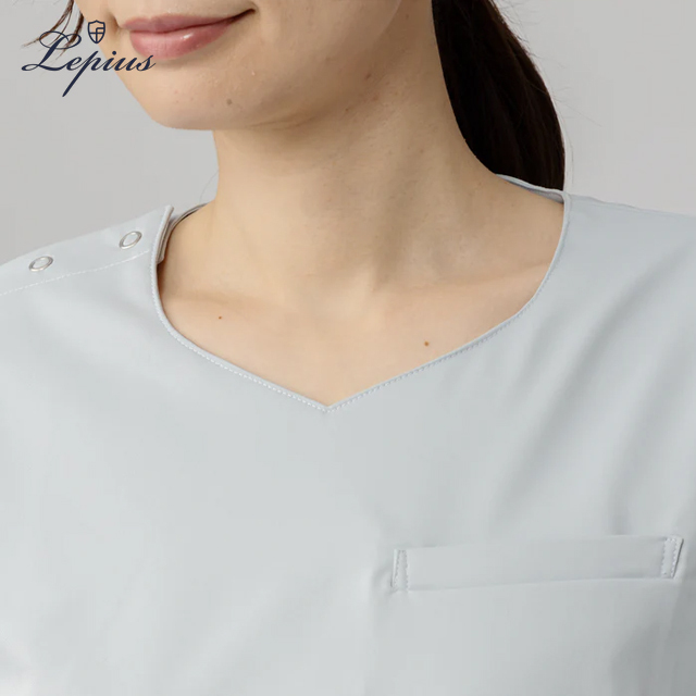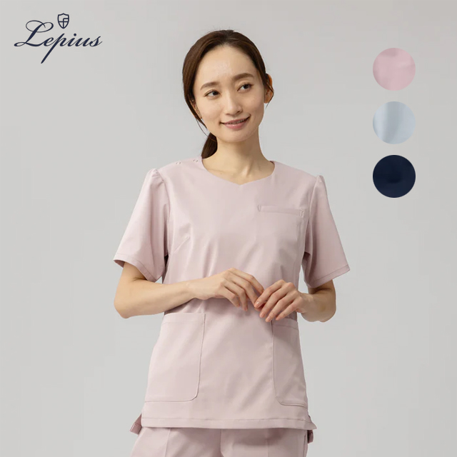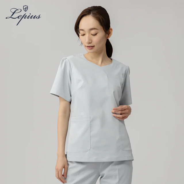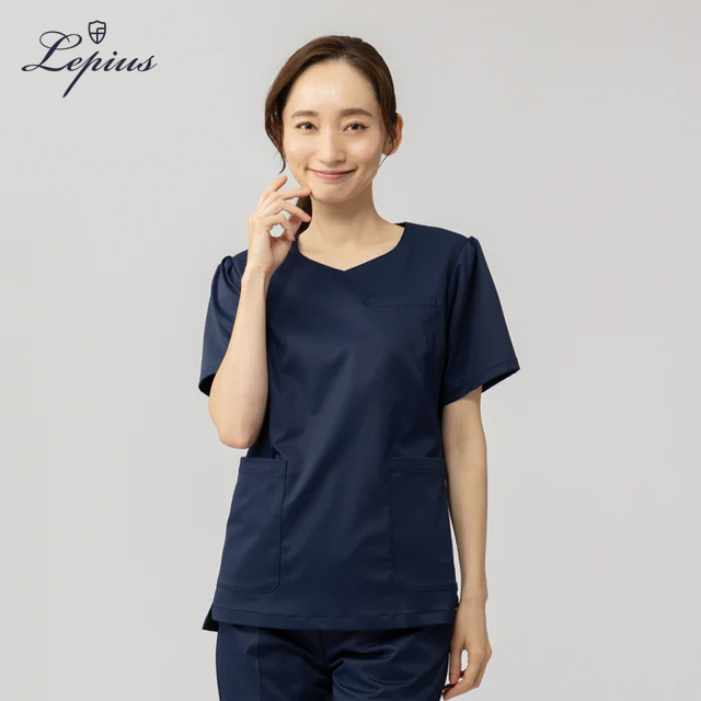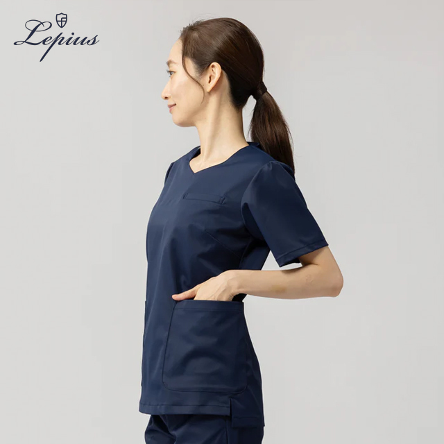 このスクラブは、ストレッチ素材と一次撥水加工を採用し、機能性とフェミニンさを両立。4つの便利なポケット付きで、医療現場での使いやすさも抜群です。