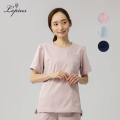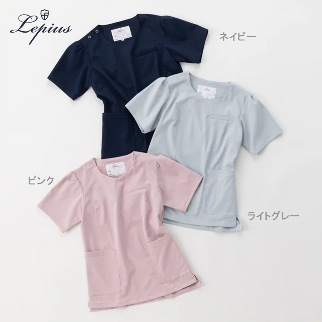 カラーバリエーションは、大人かわいいスモーキーピンク、爽やかなライトグレー、定番人気のネイビーなどをラインアップ。おしゃれな医療用スクラブをお探しの方におすすめの一着です。