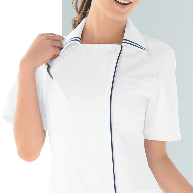 773-41 カゼン ナースウェア ジャケット 女性用 半袖 白襟 携帯ポケット スマホポケット ループ付き 工業洗濯可 制菌加工 透け防止 吸汗 制電 ストレッチ 襟付き KAZEN 医療用 看護師 学生 レディース チュニック