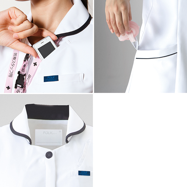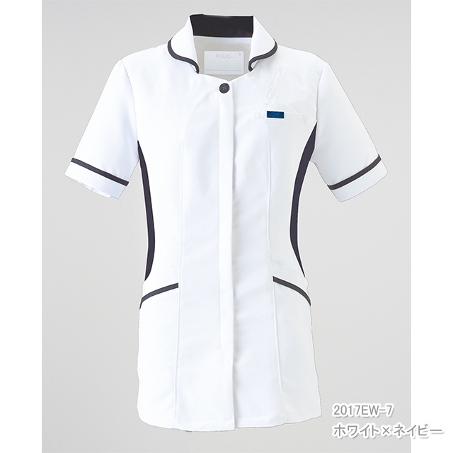 脇に入ったネイビー配色と部分的なテープ使いで全体が引き締まり、キリッとした印象のチュニック白衣です。高い防透性とほどよい伸縮性を兼ね備えた素材。両脇に入ったネイビーの配色で体をほっそり見せる効果があるチュニック。 おうち洗濯も可能なので、総合病院などでも採用実績が多いです。インナーがひびきにくく、ほどよいストレッチ性のある素材を使ったチュニックで、肌触りの良さも魅力です。 SEK制菌加工を施したチュニックなので、繊維上の黄色ぶどう球菌・肺炎桿菌・MRSAなどの増殖を抑制してくれるチュニックです。