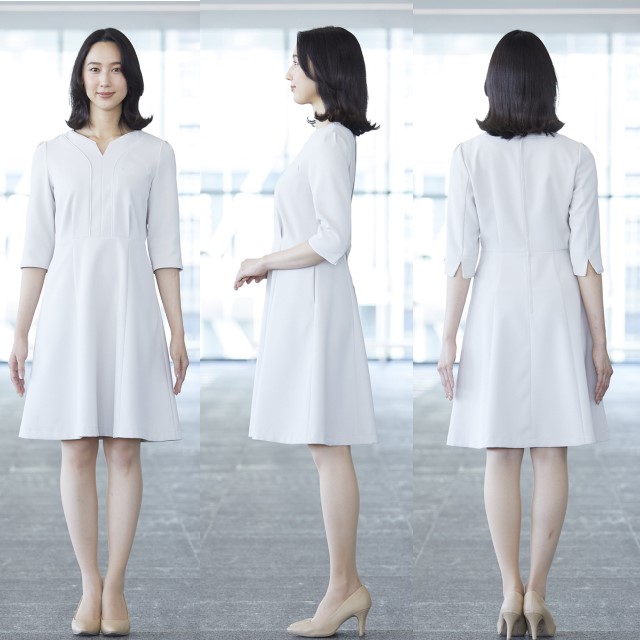 襟ぐりのリボンポケットでスカーフを付けて雰囲気を変えるとより印象アップに。女性に嬉しいデザインや機能が多く施されたおもてなしスタイルのワンピースです。