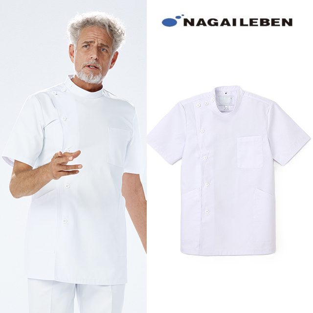 EP167 ナガイレーベン ナースウェア ケーシー ジャケット 半袖 男性用 吸水効果 ポケット付き NAGAILEBEN 医療用 看護師 薬剤師 メンズ 横掛 上衣 医務衣 白衣 ボタン留 ホワイト