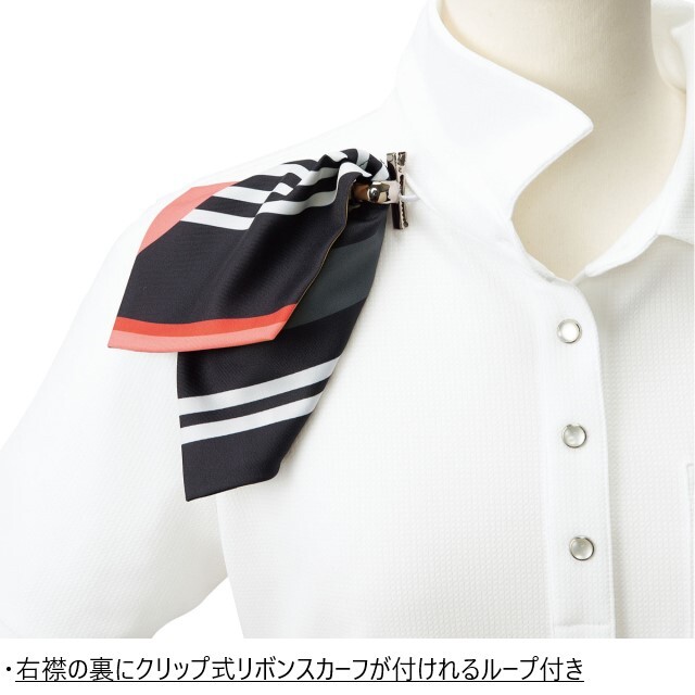 別売りのリボンを専用のループに通すことで、品の良いおもてなしスタイルになり、一枚でさまざまなコーディネートが可能な万能ニットポロシャツです。