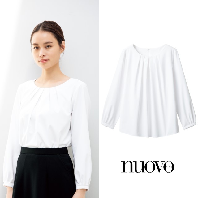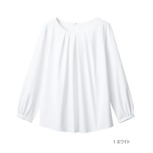 しなやかな素材の長袖ブラウスはフロントにタックを施して立体的な奥行きを出し優しげな表情に。1枚着として透けないことはもちろんのことパンツとのコーディネートやスカートにINのスタイルが可能。スーツのインナーにも合わせやすいので、コーディネートが増える使い勝手のいい長袖ブラウスです。 後ろホック留めなのでシルエットが綺麗で美しい長袖ブラウス。ストレッチ性に優れているので動きやすく、長袖なのでオールシーズン着回せるので、幅広いコーディネートが楽しめるブラウスです。