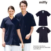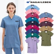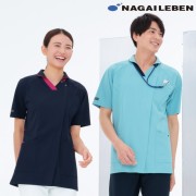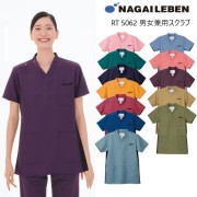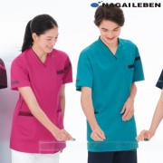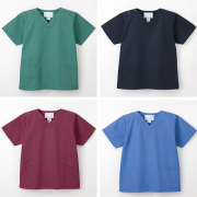 アシンメトリーな衿配色のシンプルな男女兼用スクラブ。