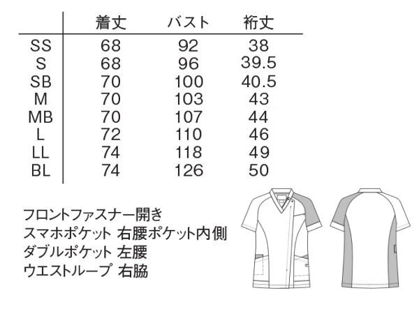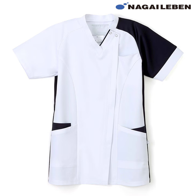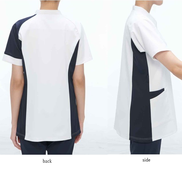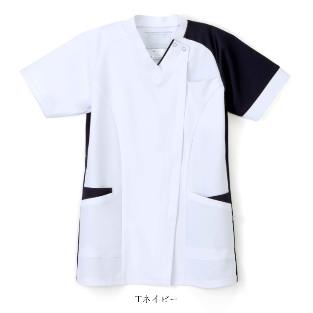 動きやすいラグランスリーブの左袖を配色にしてデザイン性を高めた男女兼用スクラブ。